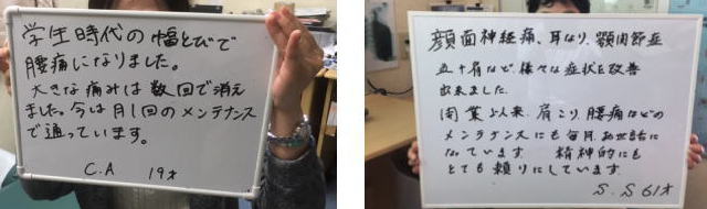 3回施術を受けたら痛みがすっかり無くなり気持ちが明るくなりました。少し無理をすると痛みが出ますが、次の日は痛みが治っています。今は隔週で施術をしていただいていますが感謝の気持ちで一杯です。